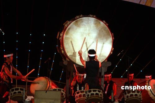 日本學(xué)子擊鼓助興中日青少年友好交流年閉幕式
