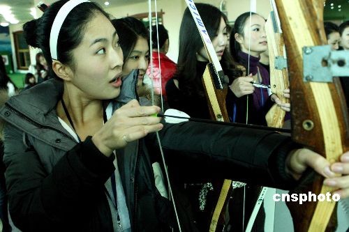 12月23日,正在北京參加2008世界亞裔小姐大賽中國區(qū)總決賽的佳麗在嘉年華游樂園里興高采烈游樂健身,圖為參賽佳麗練習(xí)射箭。中新社發(fā) 錢興強(qiáng) 攝