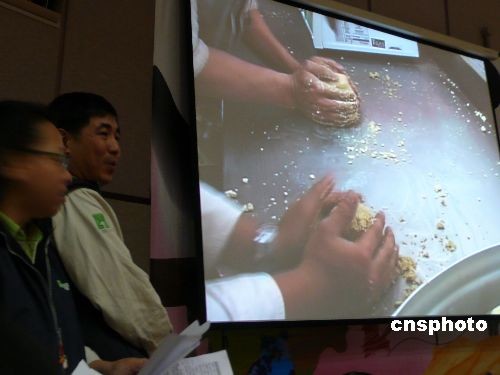 大陸贈臺一對大熊貓“團團”和“圓圓”二十三日晚間抵達臺北,住進臺北市立動物園的新光特展館。圖為動物園發(fā)言人金仕謙(左二)介紹大熊貓的精制飼料——窩窩頭的做法。 中新社發(fā) 路梅 攝