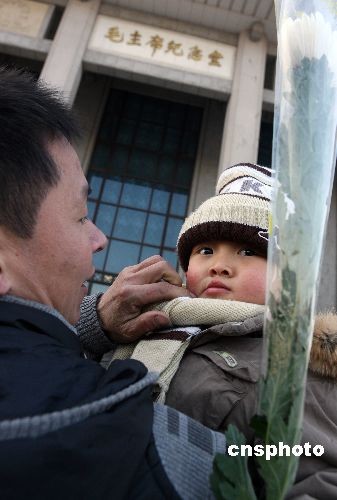 12月26日毛澤東115周年誕辰日清晨,一名四川地震災(zāi)區(qū)的三歲男童與父親到位于北京天安門(mén)廣場(chǎng)的“毛主席紀(jì)念堂”敬獻(xiàn)白菊鮮花,深切懷念偉大領(lǐng)袖毛主席。