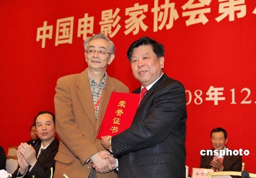 中國文聯(lián)黨組書記胡振民給著名導(dǎo)演吳貽弓頒發(fā)榮譽(yù)證書。