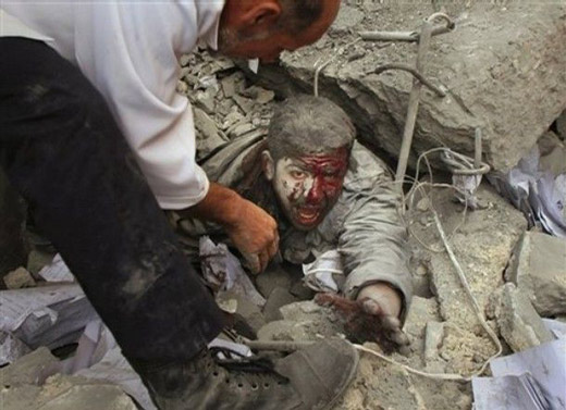 28日,一名被壓在廢墟下的巴勒斯坦人在求救。