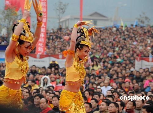 12月31日,表演“千手觀音”的業(yè)余演員,在四川大地震極重災(zāi)區(qū)的擂鼓鎮(zhèn)慰問災(zāi)民。北川縣受災(zāi)的上萬(wàn)民眾干部在此團(tuán)聚,以迎元旦文藝表演告別難忘的2008年。中新社發(fā) 賈國(guó)榮 攝