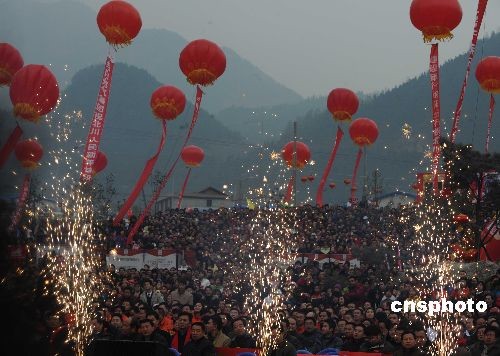 12月31日,四川大地震極重災(zāi)區(qū)的北川縣上萬民眾干部團聚擂鼓鎮(zhèn),燃放簡單的焰火迎元旦,告別難忘的2008年。中新社發(fā) 賈國榮 攝