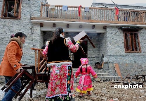 12月31日,四川地震極重災區(qū)的北川縣一戶羌族災區(qū)民眾,在2008年最后一天搬進貓兒石新建的羌寨農(nóng)家。中新社發(fā) 賈國榮 攝