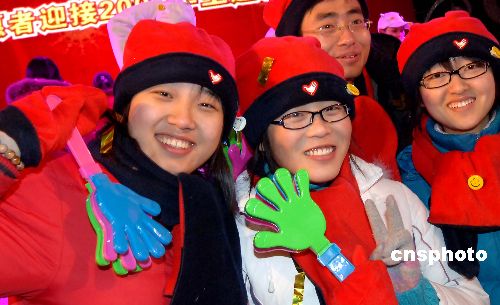 北京:2009年元旦零時(shí)到來(lái)時(shí)刻,北京600多名志愿者及社會(huì)名流在鐘鼓樓廣場(chǎng)聚會(huì),參加北京志愿者協(xié)會(huì)等部門(mén)共同舉辦的“微笑北京,和諧先鋒”主題活動(dòng),并狂歡慶新年到來(lái)。此活動(dòng)是600名志愿者和社會(huì)名流參會(huì)。北京奧運(yùn)會(huì)期間,10萬(wàn)賽會(huì)志愿者、100萬(wàn)社會(huì)志愿者、40萬(wàn)城市志愿者和20萬(wàn)拉拉隊(duì)志愿者在各類(lèi)服務(wù)領(lǐng)域累計(jì)服務(wù)超過(guò)2億小時(shí)!≈行律绨l(fā) 鄒憲 攝