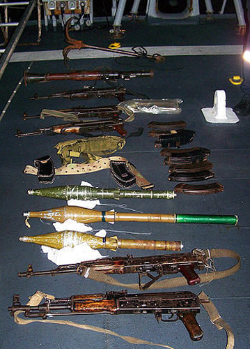 法國(guó)海軍士兵繳獲的索馬里海盜的武器。