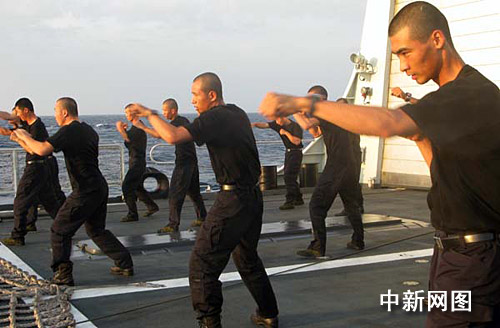 圖:“?凇迸炿S艦特戰(zhàn)隊(duì)員進(jìn)行晨練
