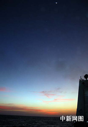 1月2日,中國海軍護(hù)航艦艇編隊繼續(xù)在印度洋航行,圖為航行途中在“?凇迸炆纤臄z的印度洋晚霞映月景觀。 中新網(wǎng)記者 孫自法 攝