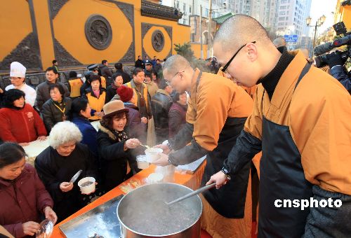 1月3日,適逢中國(guó)農(nóng)歷十二月初八傳統(tǒng)的“臘八節(jié)”,上海佛教界向民眾首次施贈(zèng)臘八粥。圖為一大早,數(shù)千市民在百年古剎玉佛禪寺山門前排起長(zhǎng)隊(duì),等候品嘗熱氣騰騰的臘八粥,祈福來年國(guó)泰民安。