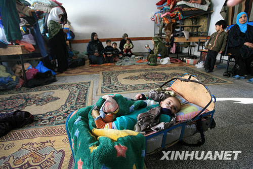 1月3日,在加沙地帶南部拉法,很多巴勒斯坦難民臨時寄居在一個難民營的學(xué)校里。以色列對加沙的空襲已造成約470人死亡、2400人受傷。許多巴勒斯坦人家園被毀,流離失所。