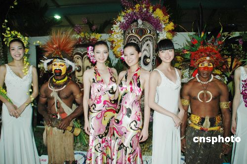 圖為來自巴布亞新幾內(nèi)亞的蘭花參展商在展臺前展示本國獨特的民族文化,吸引參會模特們合影留念。中新社發(fā) 尹海明 攝