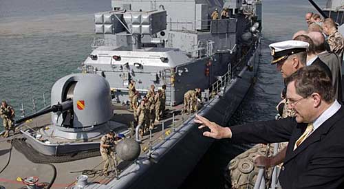 德國國防部長弗朗茨·約瑟夫·容為參加歐盟領(lǐng)導(dǎo)的打擊海盜行動的德國官兵送行。