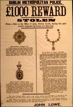 19世紀(jì)愛(ài)爾蘭國(guó)王威廉五世收集了很多珠寶——綠寶石、紅寶石、鉆石,這些珠寶都被安全地放置在都柏林城堡的貝德福德塔里,由阿爾斯特軍事首腦、他的外甥及兩名助手保管。1907年6月18日,教區(qū)牧師稱塔的大門(mén)鑰匙不見(jiàn)了。5天之后,一名清潔工在她工作時(shí)發(fā)現(xiàn)大門(mén)是開(kāi)的。接著在7月6日,她又發(fā)現(xiàn)了更奇怪的事情:裝滿珠寶的金庫(kù)大門(mén)在整晚是敞開(kāi)的。那天下午,牧師和威廉五世的外甥檢查黃金并為圣帕特里克(愛(ài)爾蘭圣徒)的領(lǐng)子裝飾珠寶,這時(shí)一位門(mén)童進(jìn)來(lái),牧師將鑰匙交與他并讓他完成剩下的珠寶鑲嵌,一分鐘之后,當(dāng)牧師再次回到金庫(kù)時(shí),他發(fā)現(xiàn)所有的珠寶都不見(jiàn)了!