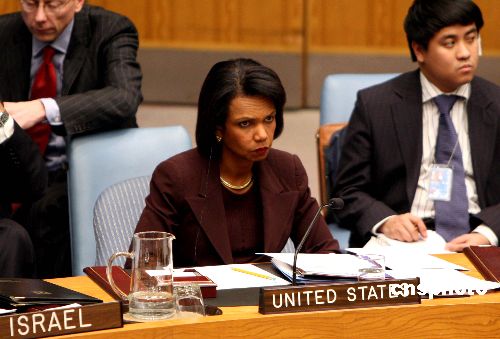 聯(lián)合國安理會一月六日晚就加沙局勢舉行緊急會議。美國國務(wù)卿賴斯出席會議。中新社發(fā) 李靜 攝