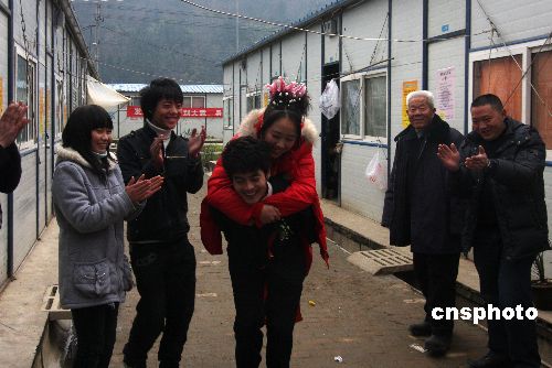 1月6日,地震重災(zāi)區(qū)北川縣曲山鎮(zhèn)王家坪八組王昌明和妻子史悅在安置的板房里舉行簡樸而隆重的婚禮,許多親友和地震災(zāi)區(qū)的群眾送來對他們新婚的美好祝福,在新年里給當?shù)貫?zāi)區(qū)帶來了喜慶氣氛。