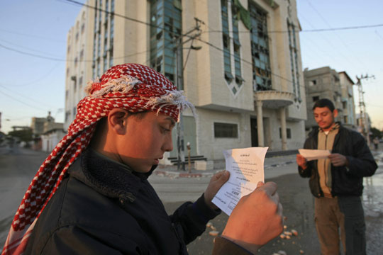 圖為當?shù)鼐用裾陂喿x以色列投發(fā)的傳單。