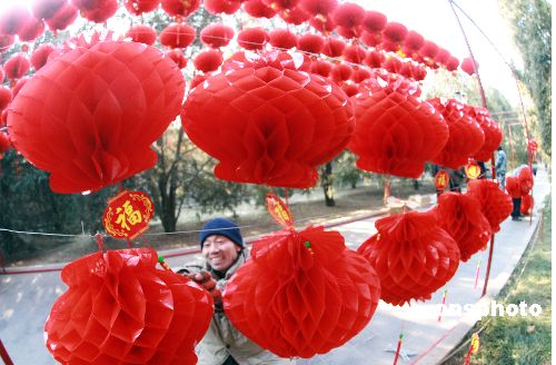 2009年1月9日,隨著春節(jié)臨近,北京地壇公園廟會的環(huán)境布置已進入倒計時階段。眾多喜慶的大紅燈籠紛紛亮相,成為京城迎春的一道靚麗風景。