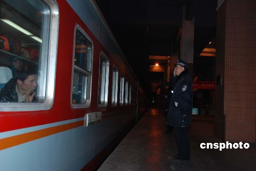 1月11日0點(diǎn)10分,杭州鐵路公安民警敬禮目送,杭州開往阜陽的春運(yùn)第一車駛離火車站,標(biāo)志著2009年杭州春運(yùn)的正式開始。該趟列車共有17節(jié)車廂,共載有1800多人。由于是一趟臨時(shí)加班車,所以車身上依然掛的是上海到淮北的牌子。中新社發(fā) 姜越潮 攝