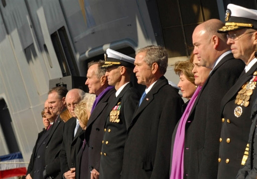 美國總統(tǒng)布什與親近家人及高層官員,參加核子動(dòng)力航空母艦“布什號(hào)”(USS George H.W. Bush)下水服役儀式。