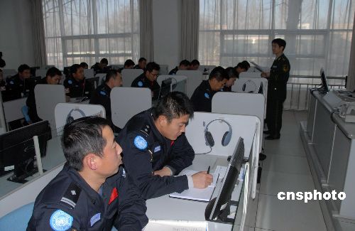 維和防暴隊員進行外語學習。中新社發(fā) 由永懷 攝