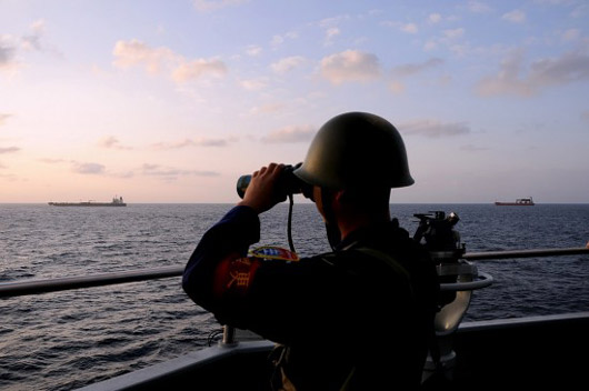1月12日,在中國(guó)海軍護(hù)航編隊(duì)的亞丁灣護(hù)航行動(dòng)中,一名戰(zhàn)士在“武漢”艦上執(zhí)勤。