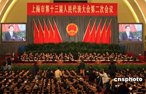 一月十三日上午九時,上海市第十三屆人民代表大會第二次會議在上海展覽中心中央大廳開幕。上海市長韓正代表市政府向大會作政府工作報告。中新社發(fā) 湯彥俊 攝