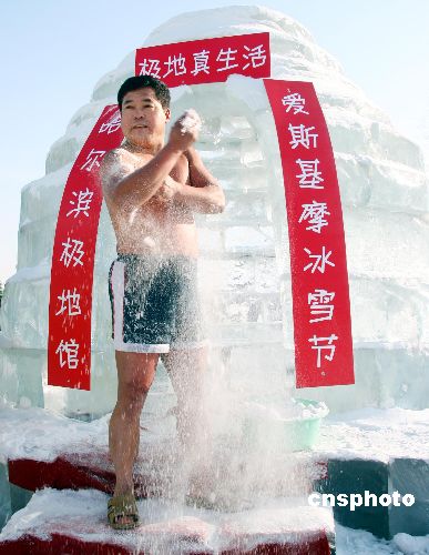 1月12日,“功夫海象”趣味擂臺(tái)賽在哈爾濱極地館再敲戰(zhàn)鼓,打破吉尼斯世界耐寒紀(jì)錄的“冰人”金松浩也參加其中。他與“功夫海象”耶娃在冰冷刺骨的海水中耐寒比拼長(zhǎng)達(dá)一個(gè)多小時(shí)。最叫絕的是金松浩躺在零下30多度的冰床上與“功夫海象”一起比試仰臥起坐,這樣的場(chǎng)面令人驚嘆不已。來自哈市的6個(gè)家庭及松花江冬泳隊(duì)的6名成員也與“功夫海象”耶娃展開激烈角逐。他們?cè)诠枮I極地館的“愛斯基摩村”里爬冰堡、拉爬犁;三九天在戶外大口大口吃冰棍、啃凍梨、嚼冰糖葫蘆。真是笑傲冰雪,妙趣橫生。中新社發(fā) 姚庭山 攝