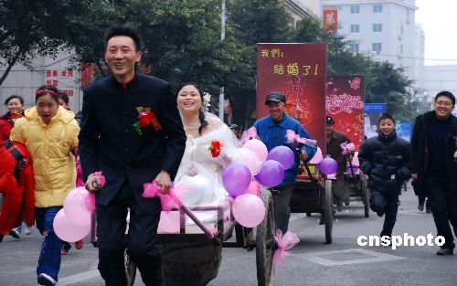 1月13日上午,一支由新郎拉著板車(chē)載著新娘的板車(chē)迎親隊(duì),浩浩蕩蕩經(jīng)過(guò)重慶梁平縣城,沿途向行人撒喜糖、紅包,然后奔向新家。這支新穎、獨(dú)特的迎親板車(chē)隊(duì),引得沿途行人駐足觀看,許多汽車(chē)主動(dòng)停下讓道,并鳴笛向他們祝賀。沿途許多市民對(duì)他們這場(chǎng)婚禮贊不絕口,送上對(duì)新人的祝福。新郎周剛介紹,新娘黃林鳳家住廣西來(lái)濱市,她愿從那么遠(yuǎn)的地方嫁過(guò)來(lái),讓他很感動(dòng),就想以一種特別的方式娶她,因此請(qǐng)人策劃了這場(chǎng)婚禮。新郎稱,租汽車(chē)需花2000元左右,租10輛板車(chē)只花了400元,用板車(chē)比汽車(chē)節(jié)約,其實(shí)節(jié)約這點(diǎn)錢(qián)對(duì)他們來(lái)說(shuō)不算什么,但主要的是這種形式終身難忘,要的是倡導(dǎo)婚事新辦節(jié)約。當(dāng)天他們向行人撒了約5公斤喜糖,撒了200個(gè)、內(nèi)裝2元錢(qián)紅包。中新社發(fā) 木文 攝