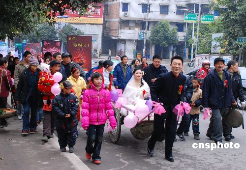 趣圖:重慶梁平小伙10輛“板車”迎娶新娘(2)