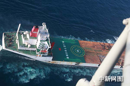 中新網(wǎng)1月14日電 中國海軍艦艇編隊正在亞丁灣海域執(zhí)行第二次護航任務(wù),為包括一艘臺灣商船在內(nèi)的四艘商船護航。圖為被護商船“振華十三”號在甲板上寫著“向人民子弟兵致敬”幾個白色大字,向中國海軍護航官兵致敬、致謝,“?凇迸炁炤d直升機空中航拍時清晰可見。