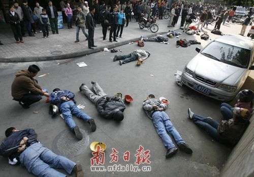 2009年1月13日上午10時(shí)30分許,記者在抓捕現(xiàn)場(chǎng)看到,廣東佛山禪城區(qū)城巴總站出站口有20名被控制住的嫌疑人橫七豎八地躺在地上。 張由瓊 攝