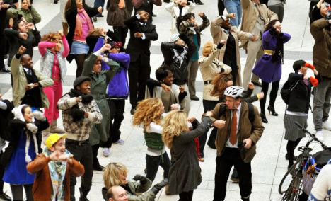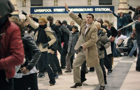 跳舞的人群中既有前來英國觀光的旅行者,也有地鐵站的工作人員,他們在一瞬間聚集,有組織的表演hip-pop、迪斯科或者舞廳舞步動作,幾分鐘后又都忽然解散。