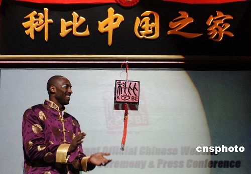 當地時間一月十五日,美國NBA巨星科比·布萊恩特中文官方網站“科比中國之家”在洛杉磯正式開通,身著唐裝的科比親自參與并親自開通網站。中新社發(fā) 張煒 攝