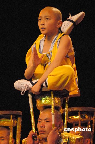 十歲小武僧身輕如燕,躍上由眾多師兄腦袋組成的“梅花樁”,有限的空間里表演少林童子功無限的招式。中新社發(fā) 楊洋 攝
