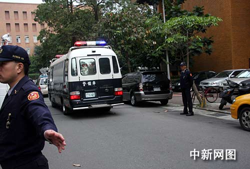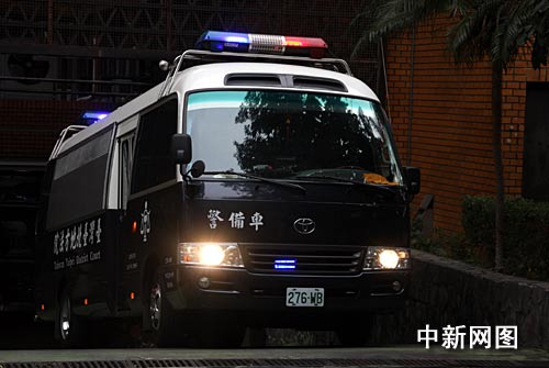 1月19日,臺(tái)北地方法院首次開庭審理前臺(tái)灣地區(qū)領(lǐng)導(dǎo)人陳水扁家弊案。傳訊陳水扁到地院準(zhǔn)備程序庭。圖為下午庭審結(jié)束,警備車押著陳水扁離開臺(tái)北地院鐵門,返回臺(tái)北土城看守所場(chǎng)景。作者:陳立宇