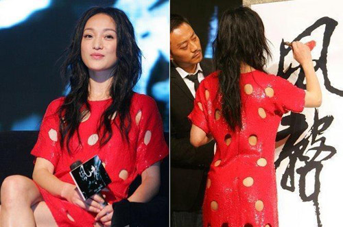 2009年1月15日,北京,電影《風聲》的開機發(fā)布會當天舉行。周迅身著紅色“漏洞”裝亮相,演繹“透明人”明艷搶鏡。