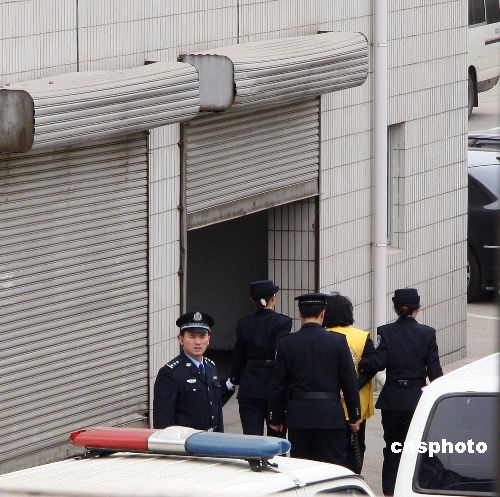 圖為三鹿集團(tuán)原董事長(zhǎng)田文華(黃衣者)被押送進(jìn)入法院。中新社發(fā) 翟羽佳 攝