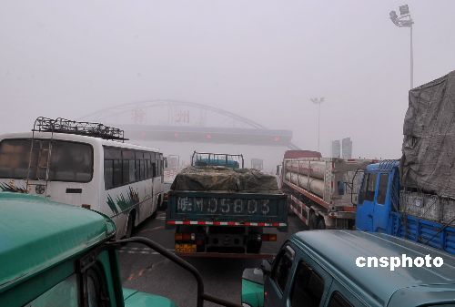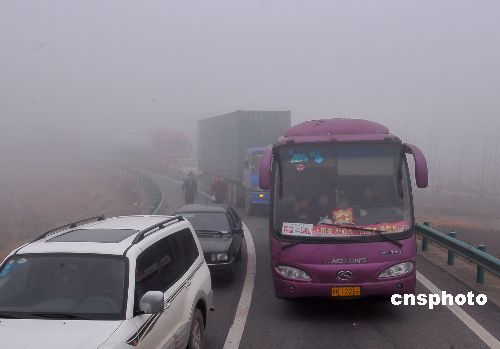 1月22日,受北方南下冷空氣與當(dāng)?shù)嘏瘽駳饬鹘粎R影響,當(dāng)天清晨5時左右起,安徽滁州遭受大霧襲擊,境內(nèi)寧洛、滬陜、京臺高速能見度在50至100米,嚴(yán)重影響春運(yùn)期間的交通安全。大霧期間,滁州高速交警對轄區(qū)所有高速入口全部實(shí)行暫時封閉,在增派干警加大路面巡邏力度的同時,還安排警車引導(dǎo)車輛行駛。截至上午10時左右,濃霧逐漸散去,所有高速道口實(shí)行了間段放行。中新社發(fā) 王家國 攝