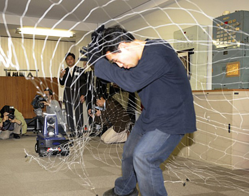 據(jù)英國媒體報(bào)道,日本一公司近日展示了一款保安機(jī)器人。這款改進(jìn)型保安機(jī)器人裝有新型傳感器,可以自動(dòng)發(fā)射網(wǎng)狀物將竊賊套住,并將現(xiàn)場圖像發(fā)到主人的手機(jī)上。