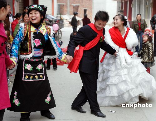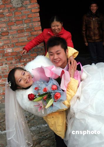 1月22日,四川安縣永安鎮(zhèn)向陽村村民袁磊與心上人在新近竣工的永久性住房內(nèi)幸福完婚。據(jù)悉,在汶川地震中,袁磊家的房屋全部坍塌,政府補貼1.6萬元后,自己又貸款5萬元,在春節(jié)前建起三間新房,娶回新娘。