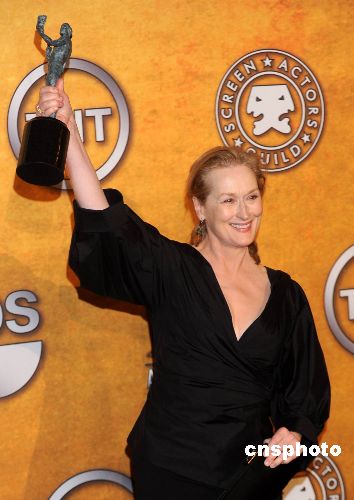 號稱奧斯卡主要風(fēng)向標的第十五屆美國演員工會獎(SAG)一月二十五日晚在洛杉磯揭曉。美國老牌影星梅麗·史翠普(又譯梅麗爾·斯特里普)憑借《虐童疑云》(Doubt)奪得電影類劇情片最佳女主角獎。梅麗·史翠普剛剛獲得奧斯卡最佳女主角提名,從而以十五次入圍奧斯卡締造了歷史紀錄。中新社發(fā) 張煒 攝