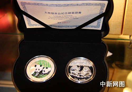為紀念大熊貓團團、圓圓來臺與民眾見面。位于臺北市和平東路三段68——1號的臺灣大洋金銀幣有限公司特委請深圳國寶鑄幣廠和臺灣“中央鑄幣廠”鑄造大熊貓赴臺紀念銀章和大熊貓來臺紀念銀章各一枚供臺灣民眾選購。中新社記者 陳立宇 攝