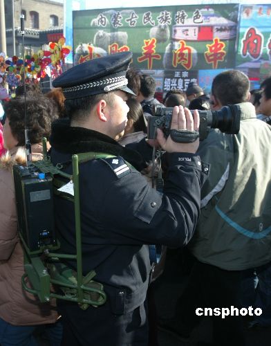 今年春節(jié),在北京的廟會上,市民可以看到背著“無線電小背包”,手拿攝像機“逛”廟會的警員。這是北京宣武警方首次將奧運安保裝備運用于廟會的安全保障。中新社發(fā) 湯亮 攝