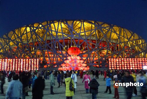 2009年1月31日傍晚,在北京奧林匹克公園中心區(qū)內(nèi),“金牛獻福”、“年年有余”、“鴻福滿倉”等鋼材結(jié)構(gòu)的雕塑及數(shù)千個大紅燈籠,在牛年春節(jié)期間首次被安放在園區(qū)人流較集中的地方,與“鳥巢”、“水立方”交相輝映。中新社發(fā) 玉龍 攝