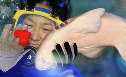 為迎接情人節(jié)到來,2月1日,日本首都東京的一個(gè)水族館,潛水員給鯊魚喂食紅心形的魚食。這一充滿浪漫情調(diào)的喂食活動(dòng)將持續(xù)兩周。