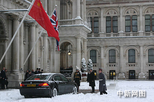 倫敦當?shù)貢r間二月二日上午八時三十分許,正在這里進行正式訪問的中國總理溫家寶前往英國外交部,出席布朗首相舉行的歡迎儀式。圖為溫家寶座車駛向觀禮臺,英國首相布朗(右二)在車旁迎接。 中新社記者 張朔 攝
