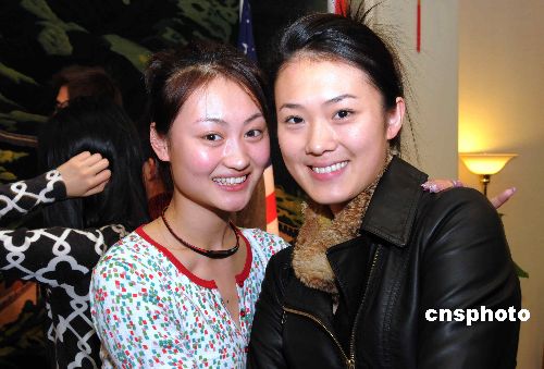 兩位中央民族歌舞團(tuán)美女演員在歡迎招待會(huì)上合影留念。中新社發(fā) 邱江波 攝
