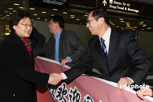 中國駐美大使周文重(左)前往機(jī)場,迎接應(yīng)邀前來的中國國務(wù)院僑辦主任李海峰及"文化中國·四海同春"藝術(shù)團(tuán)一行抵達(dá)華盛頓。
