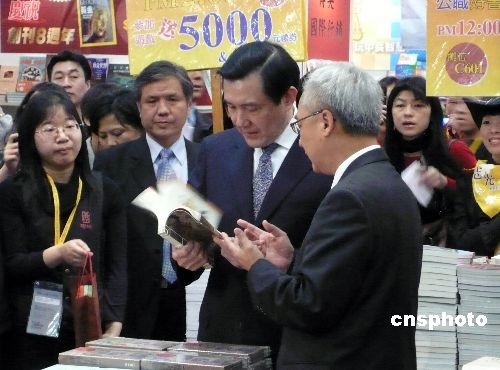 圖為馬英九(中)前往書展用消費券購書。中新社發(fā) 路梅 攝